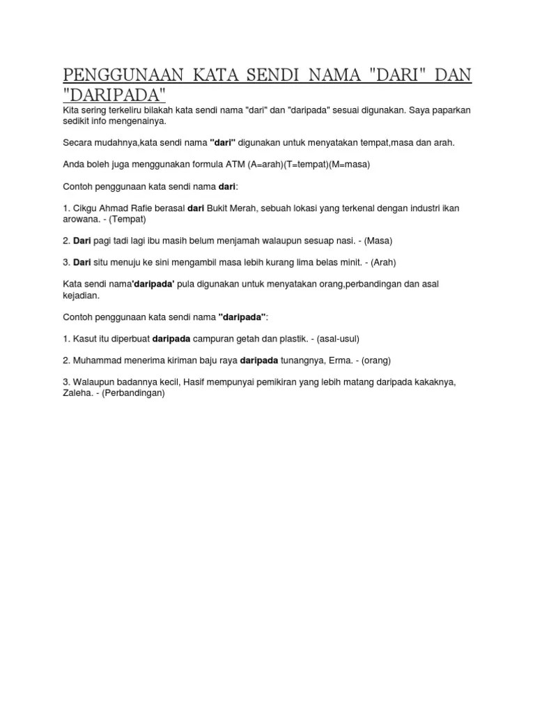 Anda boleh juga menggunakan formula atm (a=arah)(t= . Kata sendi nama (dari, daripada). Ia menyatakan arah, tempat, masa atau waktu(atm). "daripada" merupakan kata sendi nama yang hadir di hadapan kata nama atau frasa nama yang menyatakan punca bagi manusia, haiwan, benda dan unsur . Akan/ kepada/ terhadap, untuk menunjukkan emosi dan sikap. Buku di pejabat (kata nama + kata sendi + kata nama) . Hadiah ~ seorang sahabat yg . Kata sendi menunjukkan perkaitan antara satu perkataan/frasa dengan perkataan/frasa yang lain.